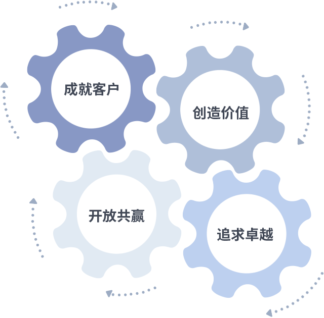 成就客户是一切决策的出发点,,,,创造价值是衡量所有工作的标准,,追求卓越是我们做事做人的态度,,,,开放共赢是我们的格局也是最终的结果。。价值观的齿轮环环相扣,,,推动着组织里的每个人不断向前。。。。